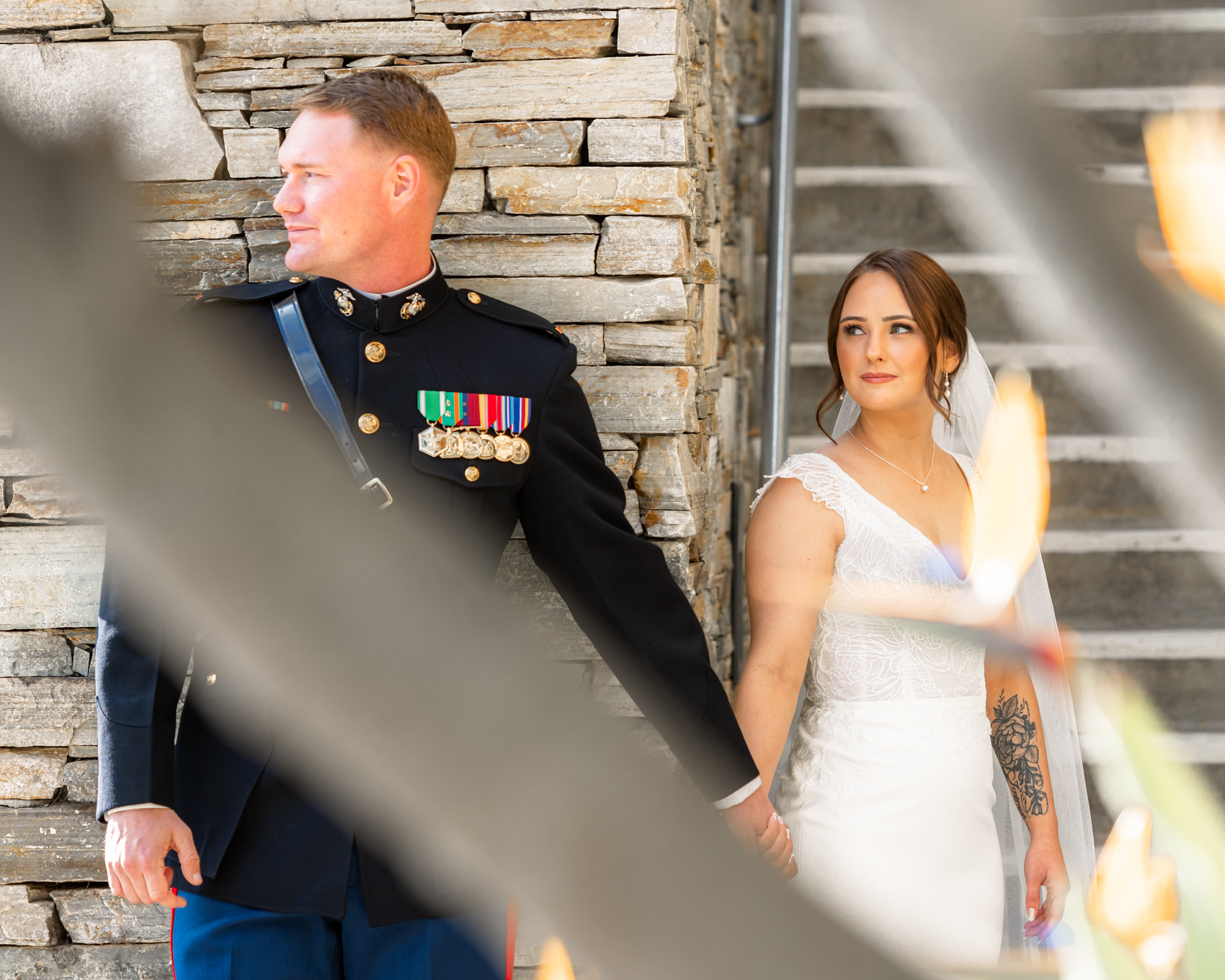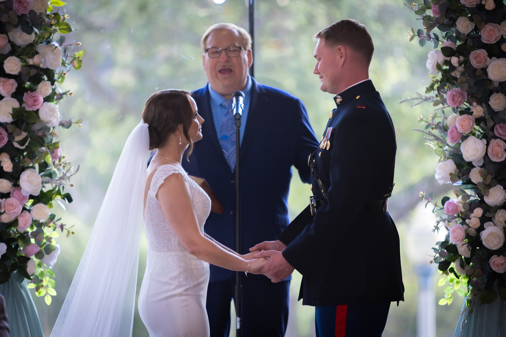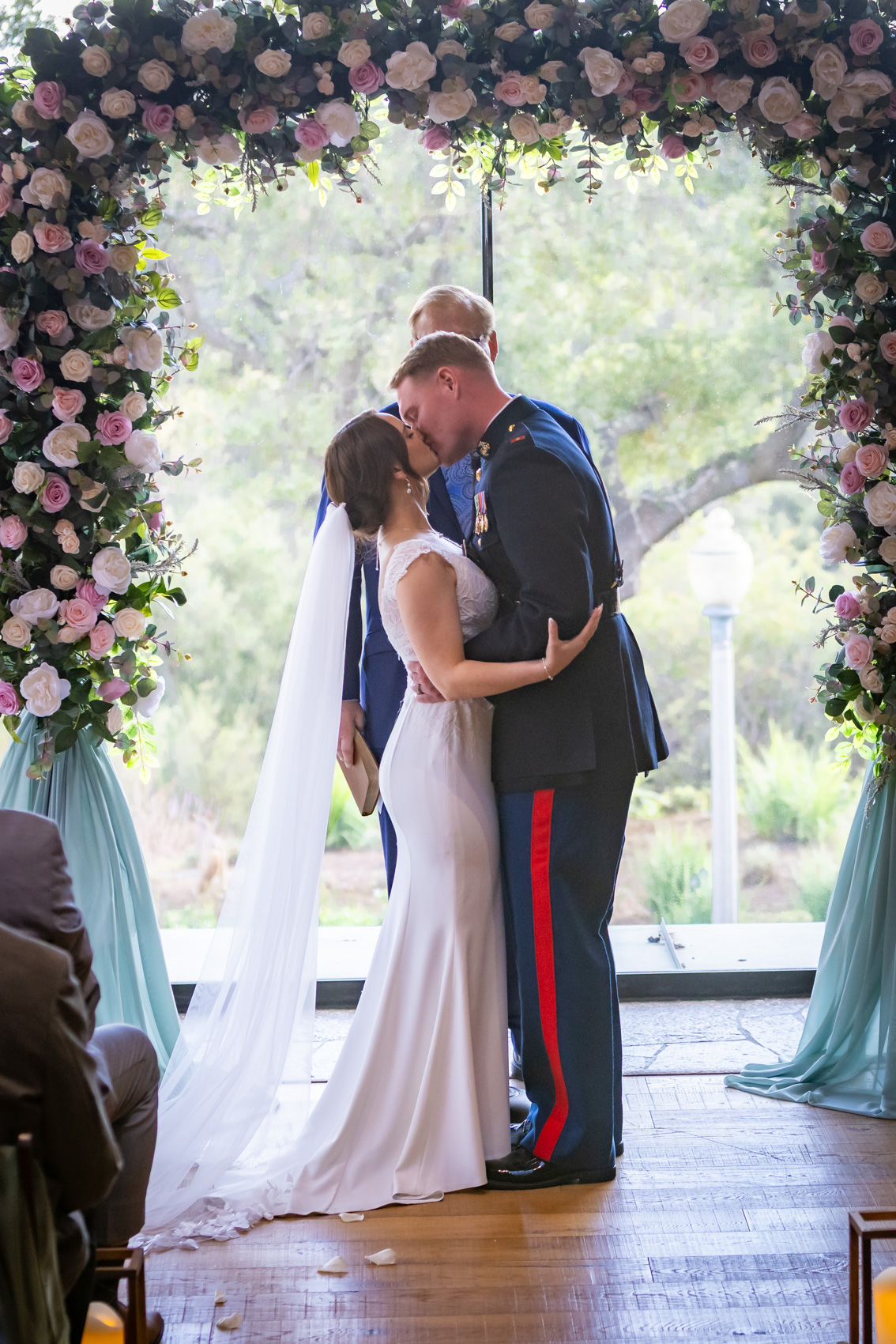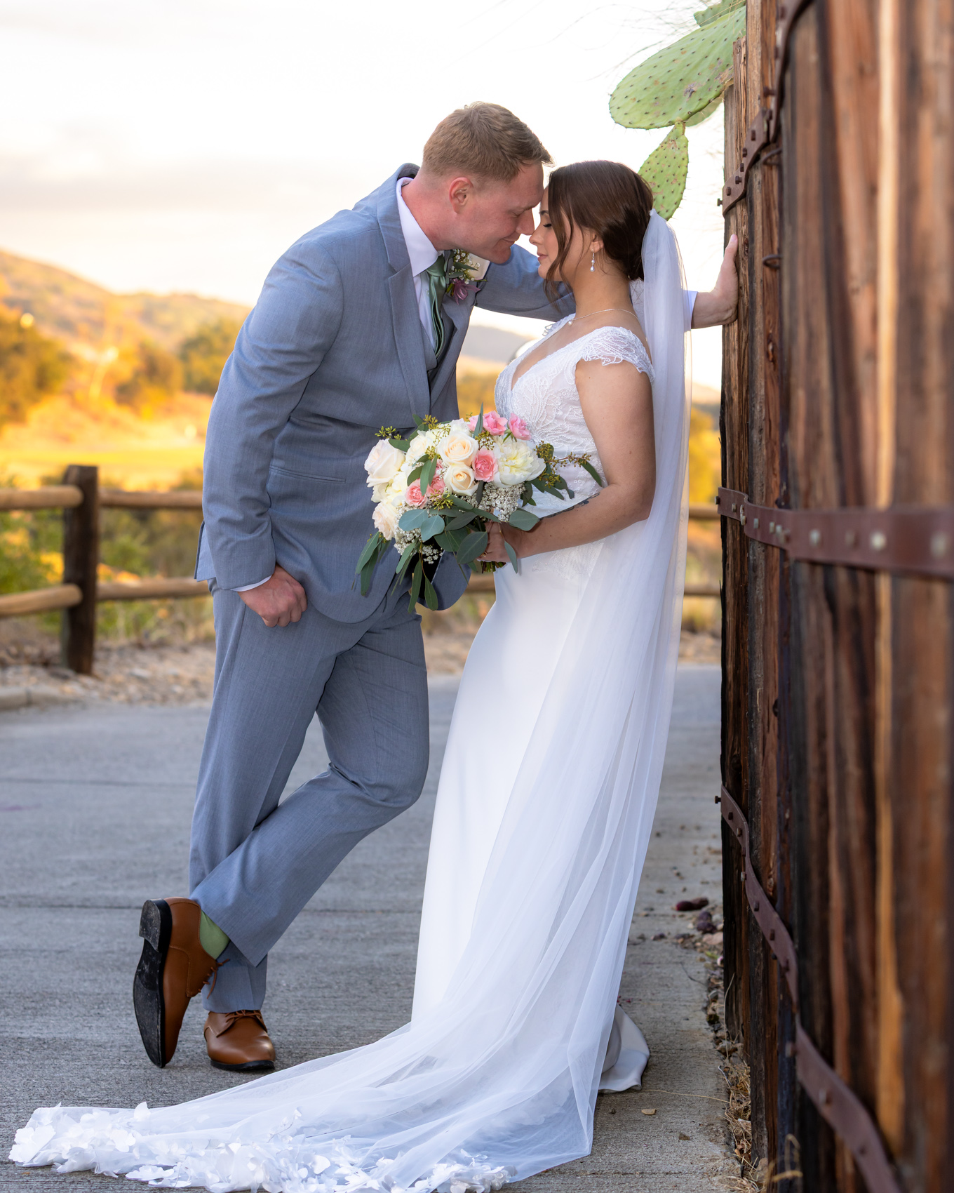 The courtyard itself, with its charming architecture and lush landscaping, provides an intimate backdrop for couple portraits. The golf course offers expansive views that are particularly magical during golden hour. Interior spaces feature elegant details and large windows with beautiful natural light. Seasonal changes bring different colors to the surrounding canyon, meaning Dove Canyon’s appearance transforms throughout the year while always remaining beautiful for wedding photos of the bride and groom becoming husband and wife.